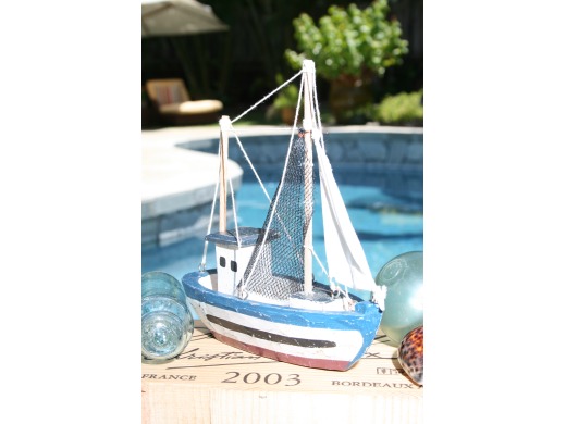 Here is a very charming fishing boat with real sails and nets in red and white, blue and white or yellow and white coastal colors.