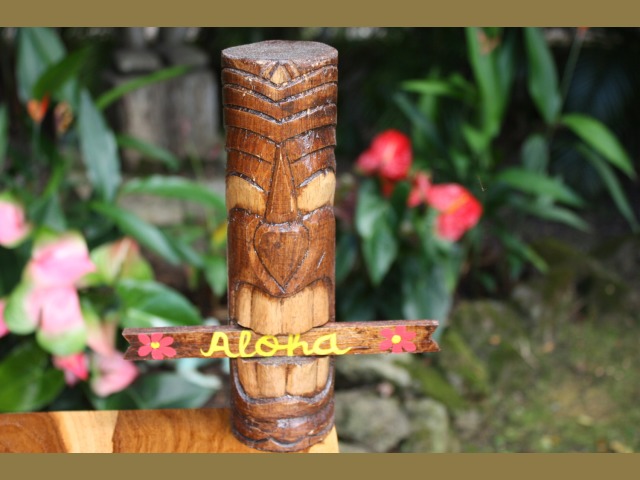 This wooden Ku Tiki totem comes with an Aloha sign in its mouth (removable) - will bring you strength and prosperity ... measures 10 inches tall (25cm). This hand carved tiki totem has been waxed to give a nice antique finish.