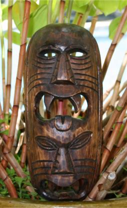 This is a wood carved Fijian EVIL SPIRIT HUNTER tiki mask with tiki gods representing STRENGTH & ABUNDANCE & PROTECTION.