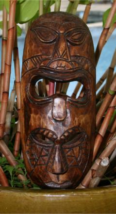 This is a wood carved Fijian LOVE tiki mask with the deity representing HAPPINESS. The mask measures 12 inches tall.