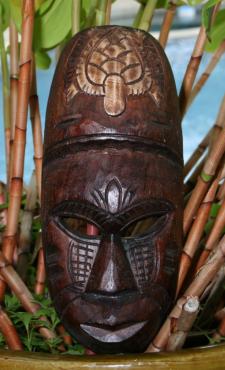 This is a wood carved Fijian TURTLE tiki mask. He is the symbol of THE WINNER. The deity is representing the OCEAN GOD. The mask measures 12 inches tall.