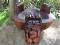 This hand carved kava bowl features a traditional bowl, flanked by 3 Tiki Gods. Most Hawaiian bowls and platters were undecorated. A few carved dished have been preserved, showing human figures holding a plate.