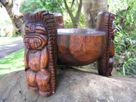The carving shows an effigy of KU, Tiki God of strength, war and healing. It measures 12" long and 8" high and is made of premium Acacia (Monkey Pod) wood which has been stained to a rich walnut color. This unique piece of hawaiiana is beautiful as a center piece for a dining room. It can also serve as a wooden salad dish and is perfect as a scorpion or kava bowl in your tiki bar or luau. The possibilities are endless... Also a great gift idea with MUCH ALOHA!
