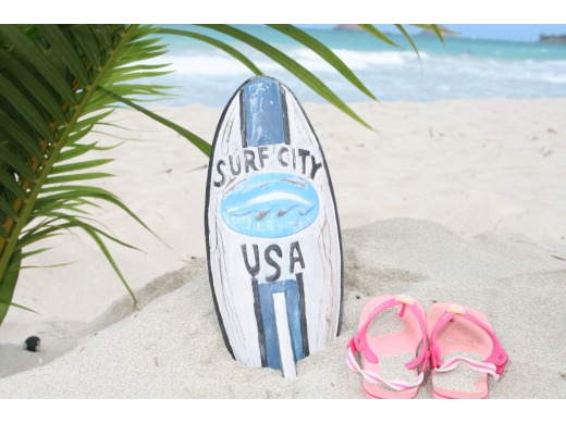 This is a hand carved, vintage/weathered looking surf sign with the wording: "SURF CITY USA". Each letter was hand carved and raised.