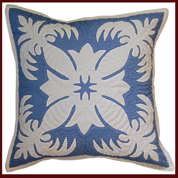 18" x 18" COLOR: Off-White on Wedgewood Blue COCONUT-PINEAPPLE DESIGN Hawaiian Hand Quilted Pillowslip