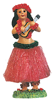 This beautiful dashboard doll is sculpted by an artist and hand painted to detail. She wears a classic red hula skirt and a Hawaiian flower lei around her neck. Place her on your car dashboard and watch her sway her grass skirt. She will be your perfect driving companion...