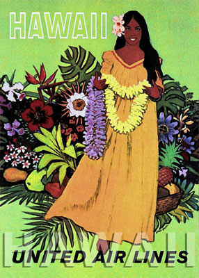 This tourist airline travel poster (ca.1955) portrays the hawaiian spirit of aloha which is still very much alive today. It depictins a graceous wahine with outstreched, welcoming hands, holding flower leis.