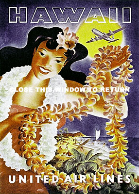 This tourist airline travel poster (ca.1948) portrays the Hawaiian spirit of aloha which is still very much alive today. It depicts a graceous wahine with outstretched, welcoming hands, holding a flower lei. In the back ground, Waikiki beach and Diamond Head can be seen.