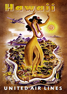 This is a famous vintage United Airlines stratocruiser tourist poster (ca.1950). It portrays the hawaiian islands and a hula dancer, with swaying hips and welcoming hands, enticing visitors to our sunny paradise.