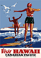 Hawaii has always been synonomous with surf and sun... No wonder surfing themes have been so popular to entice visitors to the islands. True to the spirit of Hawai'i, this CANADIAN PACIFIC LINES travel poster, features two surfers on their classic longboards, riding the Waikiki waves. In the background a cruise ship and fluttering sea birds can be seen.
