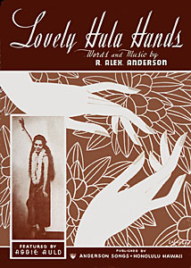 This vintage Hawaiian Sheet Music Cover (ca 1930) for the popular melody, LOVELY HULA HANDS, features Ms. Aggie Auld, the hula dancer in the inset. Nowdays, when tourists go to a hula performance, they are instructed to watch the hands... the hands tell the story... of course, nobody does...