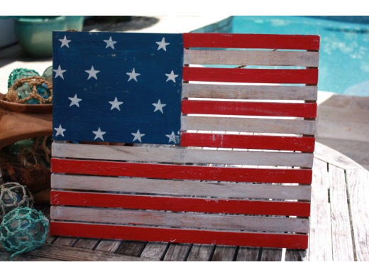 Here is a very charming hand carved and hand painted USA flag with a rustic finish of blue, red and white.