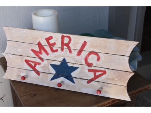 Here is a very charming hand carved and hand painted sign/hanger "America" with a rustic finish of blue, red and white.