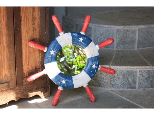 Here is a hand carved and hand painted ship wheel the American way! The finish is rustic and will add a nice touch of Americana decor!