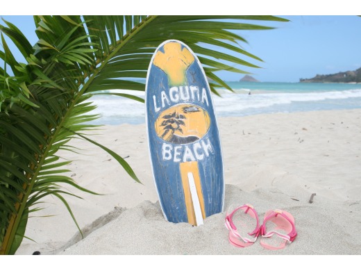 This is a hand carved, vintage/weathered looking surf sign with the wording: "LAGUNA BEACH". Each letter was hand carved and raised.