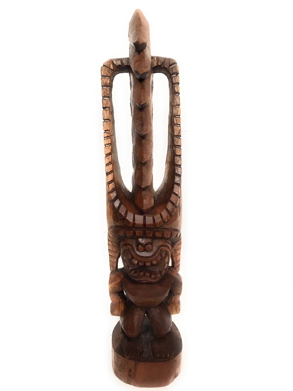 This is a beautiful Tiki measuring 20 inches tall (50 cm). The image is possibly one of the finest kona-style images, presenting all of the dynamic qualities of the style and the abstraction of the headdress, hair and eyes, which in this instance are triangular, faceted elements set into the hair pattern.