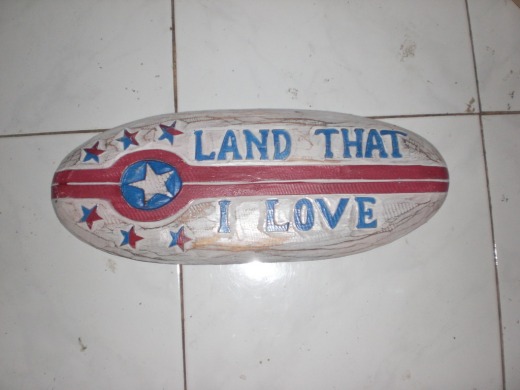 Here is a very charming hand carved and hand painted surf sign "Land That I Love" with a rustic finish of white wash.