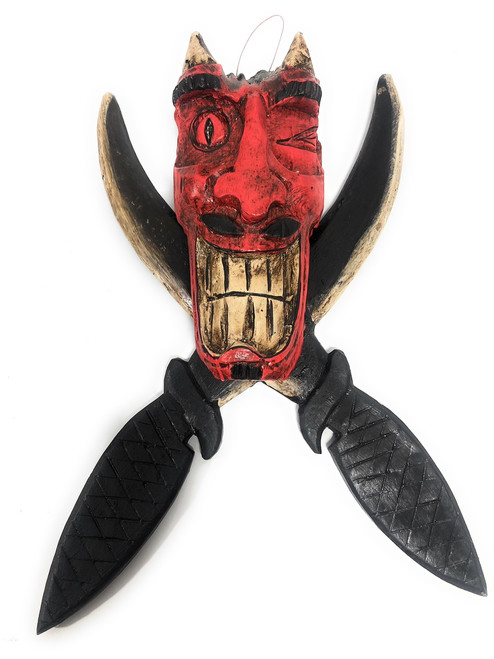 Here is a hand carved smiley devil wall hanging featuring some cross swords