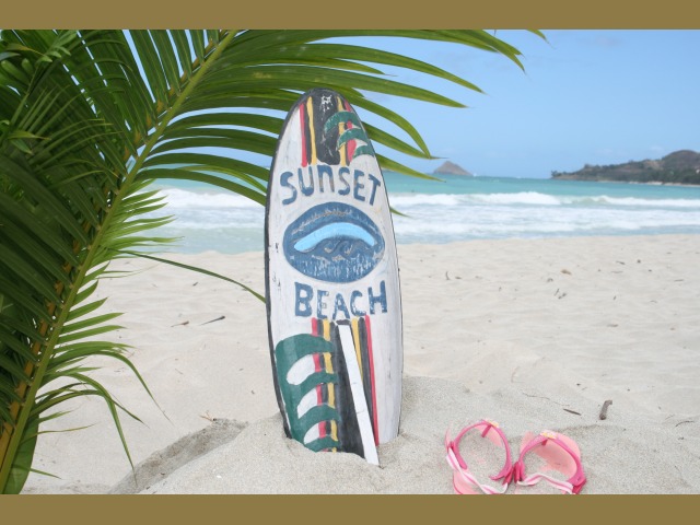 This is a hand carved, vintage/weathered looking surf sign with the wording: "SUNSET BEACH". Each letter was hand carved and raised.