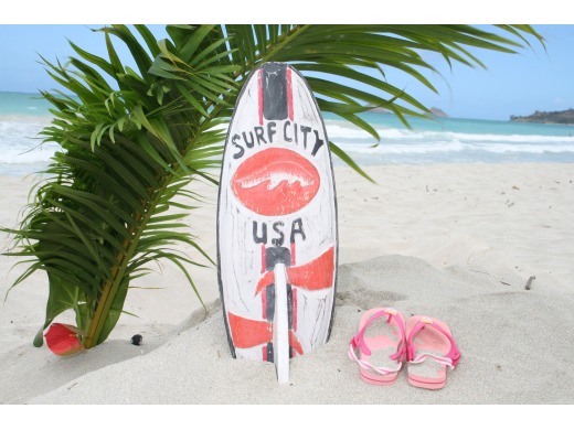 This is a hand carved, vintage/weathered looking surf sign with the wording: "SURF CITY USA". Each letter was hand carved and raised.