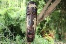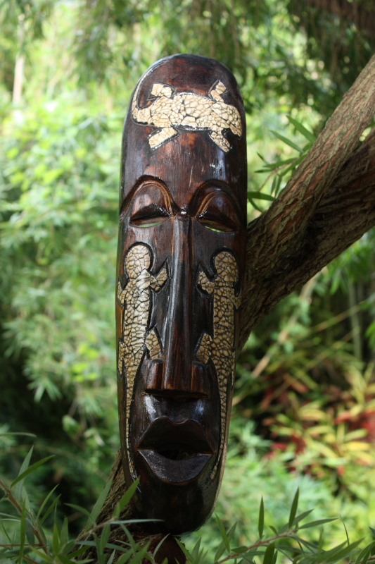 This primitive mask with three GECKOS features very intricate details; the design was enhanced by applying eggshells then varnished. It is standing 20 inches tall.