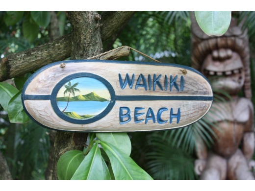 Here is a hand made vintage looking Tiki sign with the wording " WAIKIKI BEACH" and an exotic, detailed surfing scene with Diamond Head in the background, painted in bright colors on it. This sign was executed by our master carver, then by our skilled painter. Each letter is hand carved and raised.