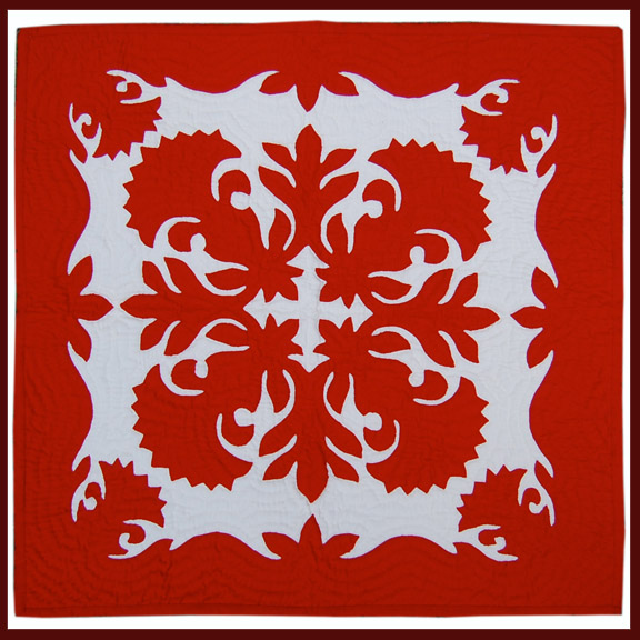 Each wall hanging is hand quilted by Master Quilters taught in the traditional Hawaiian style of quilting. Each Quilt has over 250,000 stitches and average 6-8 stitches per inch. We appliqué the design using the hidden or "blind" stitch onto the background material. It is then quilted with a ripple or echo pattern. Every piece is hand made with great care to insure your total satisfaction. Please contact us for availability and special orders (at NO EXTRA COST!).