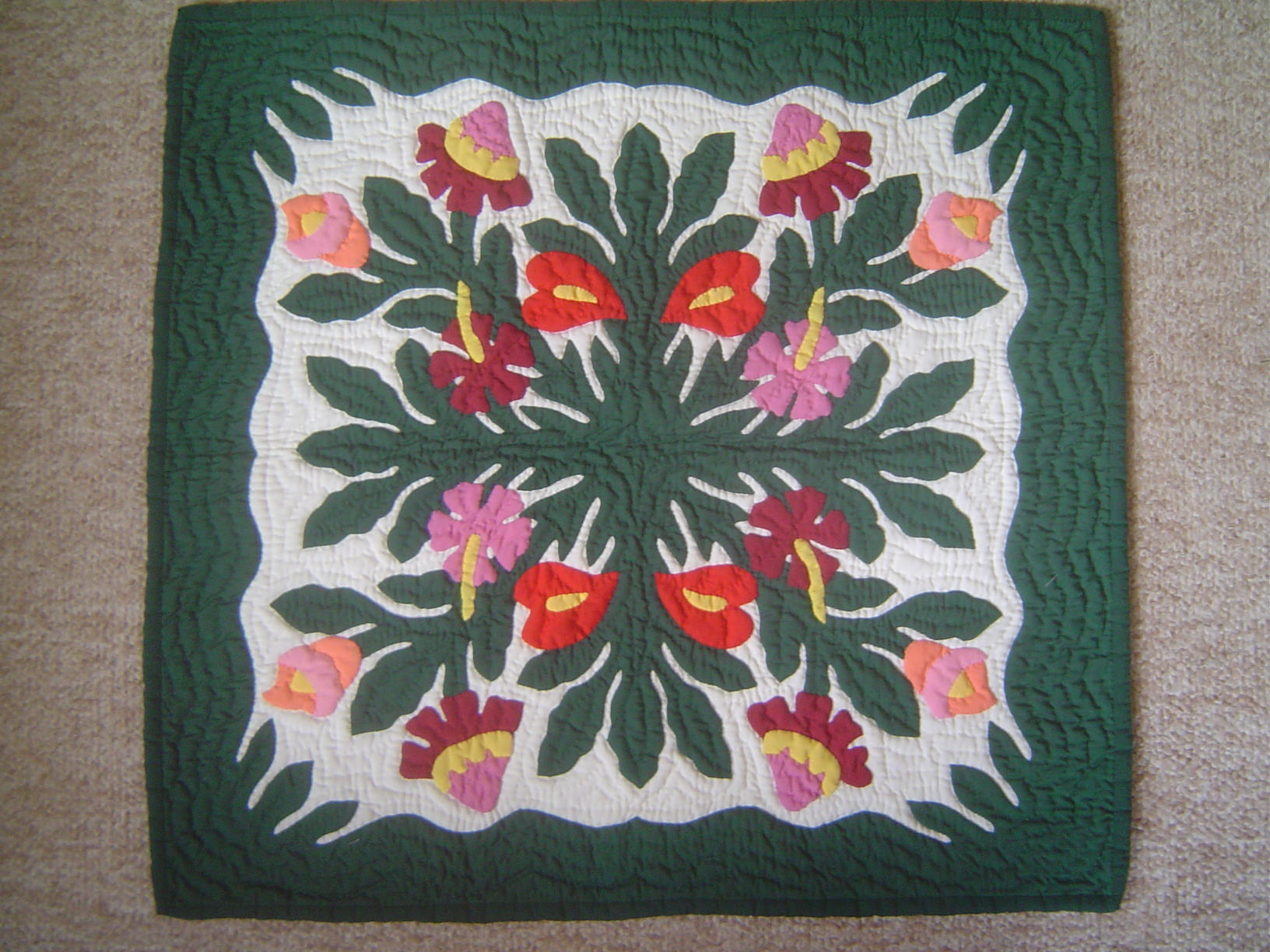 Each wall hanging is hand quilted by Master Quilters taught in the traditional Hawaiian style of quilting. Each Quilt has over 250,000 stitches and average 6-8 stitches per inch. We appliqué the design using the hidden or "blind" stitch onto the background material. It is then quilted with a ripple or echo pattern. Every piece is hand made with great care to insure your total satisfaction. Please contact us for availability and special orders (at NO EXTRA COST!).