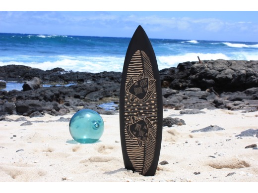 Here is a hand carved surfboard featuring 2 swimming turtles and tribal carvings.