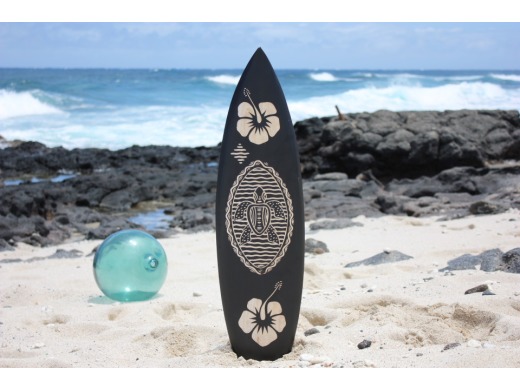Here is a hand carved surfboard featuring a turtle and hibiscus flowers.