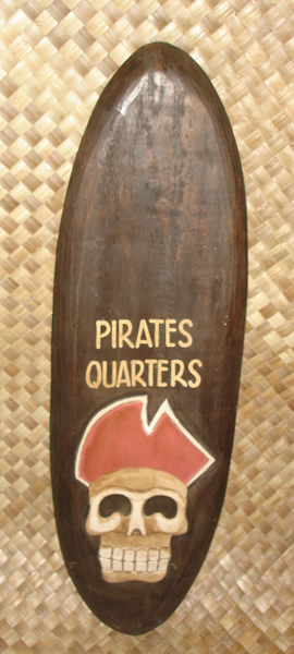 This exotic PIRATES QUATERS Skull Sign has a pirate face on the blade. It was hand carved and hand painted with great attention to details.