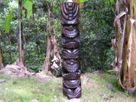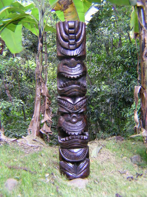 This is a hand carved Tiki depicting Ku, Tiki of strength but also Kanaloa, Tiki of the ocean, fishing and abundance. This Tiki totem has also a double meaning, love and prosperity, which can be distinguised by the set of eyes going upward and downward. This Totem pole measures 39 inches (over 3-foot) tall and 9 inches thick. Made of premium Acacia wood.