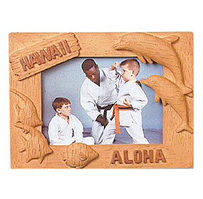 This artfully crafted, island inspired foto frame features two leaping dolphins and tropical fish around the border. It has the wording HAWAII carved diagonally across the top of the frame and ALOHA on the base.