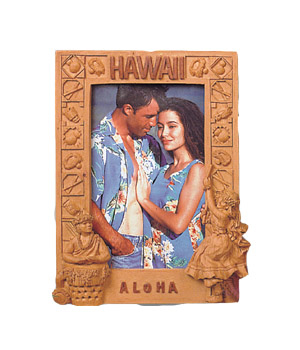 This artfully crafted, island inspired foto frame features two hula dancers and island themes around the border. It has the wording HAWAII carved across the top of the frame and ALOHA on the base.