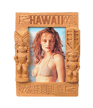 This artfully crafted, island inspired foto frame features two tiki statues around the border. It has the wording HAWAII across the top and petroglyph art around the base.