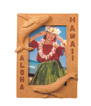 This artfully crafted, island inspired foto frame features two whales around the border. It has the wording HAWAII and ALOHA on the sides of the frame.