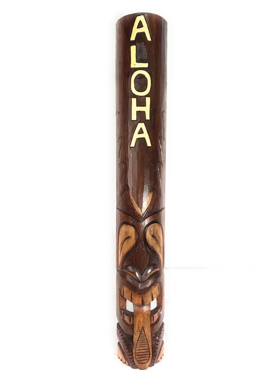 Here is a hand carved Tiki mask and hand painted with "Aloha". This Tiki mask depicts Hina (sunrise tiki).