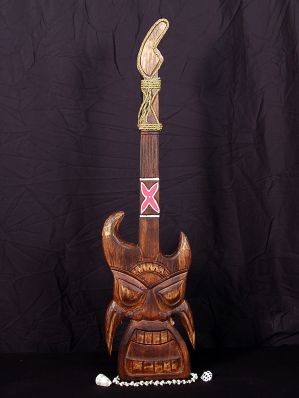 This is an artfully crafted GUITAR tribal tiki mask. It has been hand carved and hand painted with great attention to detail. This Tiki guitar depicts the tiki god of music. Comes ready to hang.