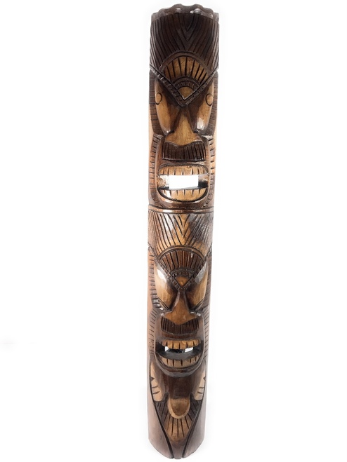 THis is a hand carved Tiki mask and hand painted, antique finish. This Tiki mask depicts Lono and Kuka (health/love tiki).