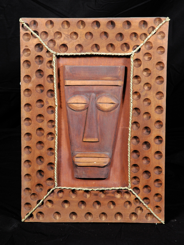 Here is an artfully designed wooden frame with a Tiki Papua mask inside.