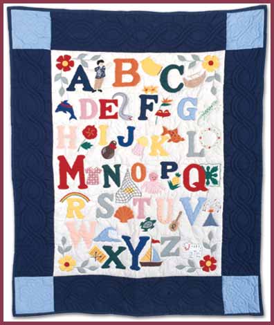 Keikis are very special in Hawaii. They are a gift from heaven and are given the utmost care and attention in the true aloha spirit. This beautiful hand- stitched ABC baby quilt features extraordinary Hawaiian themes which are appliqued and embroidered between the lettering.