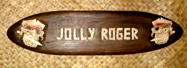 This exotic JOLLY ROGER Skull Sign has a two pirate's faces on the blade. It was hand carved and hand painted with great attention to details.