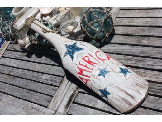 Here is an artfully designed and patriotic tiki Paddle with "America" on it.