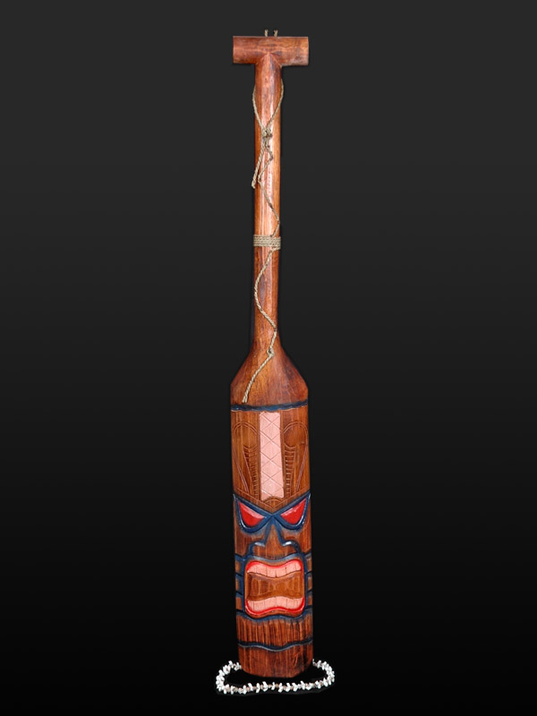 This is an artfully designed Tiki paddle that was hand carved and painted with great attention to details. It has a carved and painted Tiki God on the blade. The braided line around the handle adds to the yachting theme. Measurement: 46"X6" (120 cm by 15 cm). Comes ready to hang.