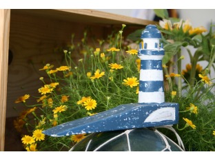 Here is a very cute door stopper shaped like a lighthouse and comes in rustic coastal colors: blue, red or yellow