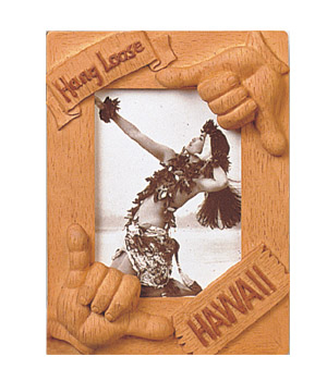 This artfully crafted, island inspired foto frame features two hands making the shaka sign in greeting. It has the wording Hang Loose carved diagonally across the top of the frame and Hawaii across the base.