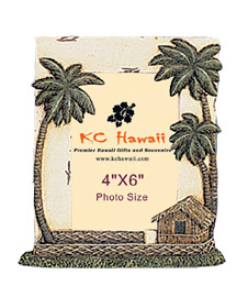 This is a colorful, island inspired fotoframe featuring palm trees and a Hawaiian style tiki grass hut.