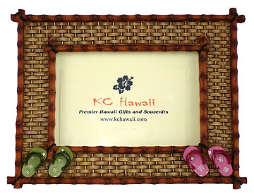 This is a vintage style, island inspired foto frame featuring bamboo poles and hawaiian "slippahs".
