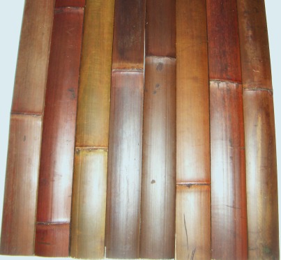 Mahogany color bamboo slats are harvested from the large diameter MOSO bamboo. The slats/planks are cut into strips along the length of the pole