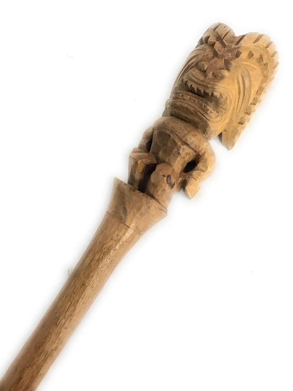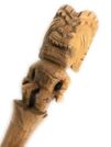 This is TIKI KU: the warrior and symbol of strength and sunrise. This is another of the many types of wooden images of gods. With its pointed prop (stick), this type could be stuck in the ground or in the wall thatch to support the image in an upright position. The crest on the head is quite common, but is seldom found on other small images which do not have the "stick extension".